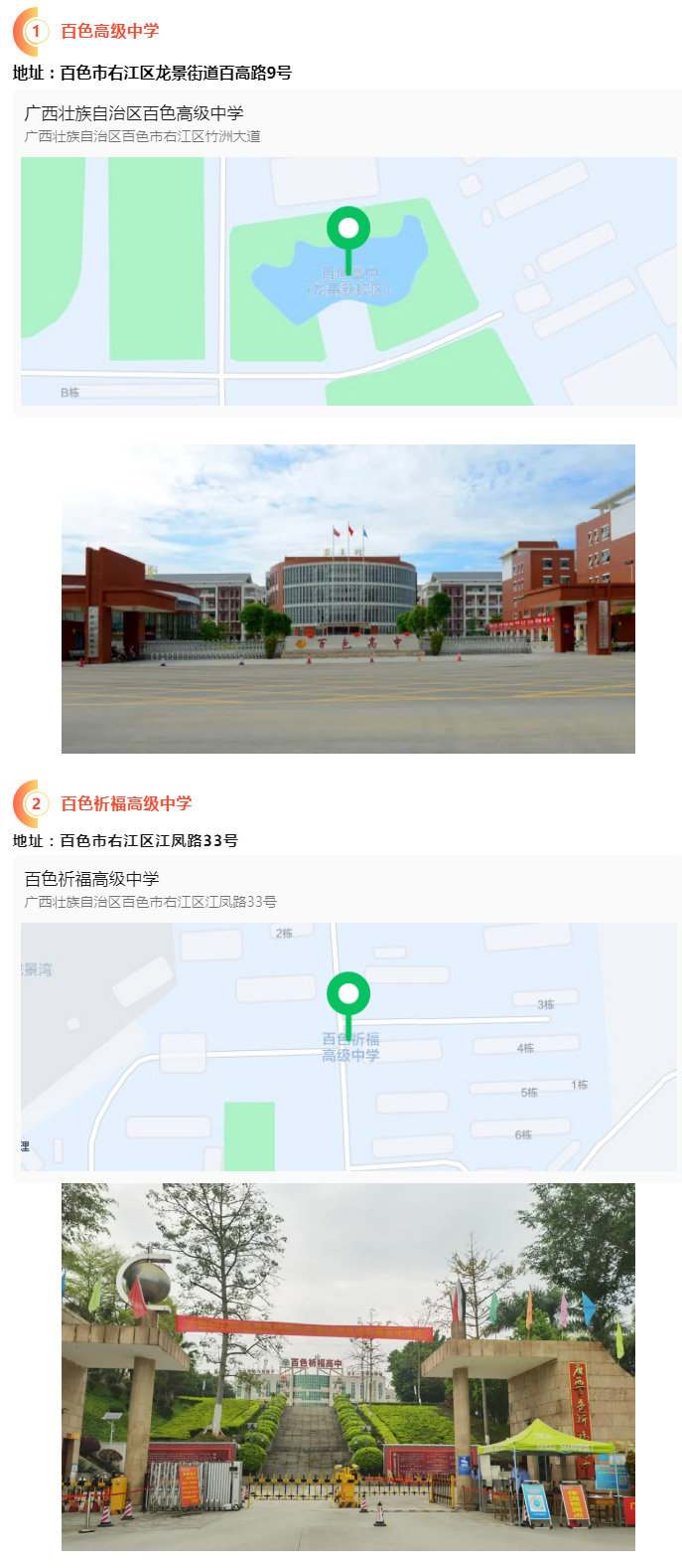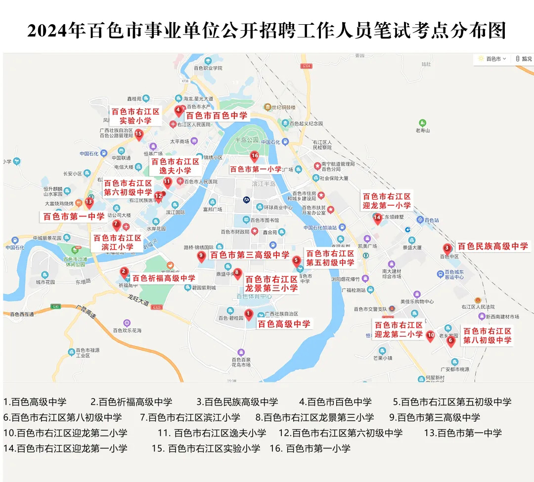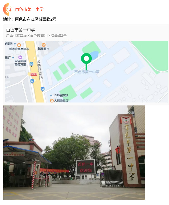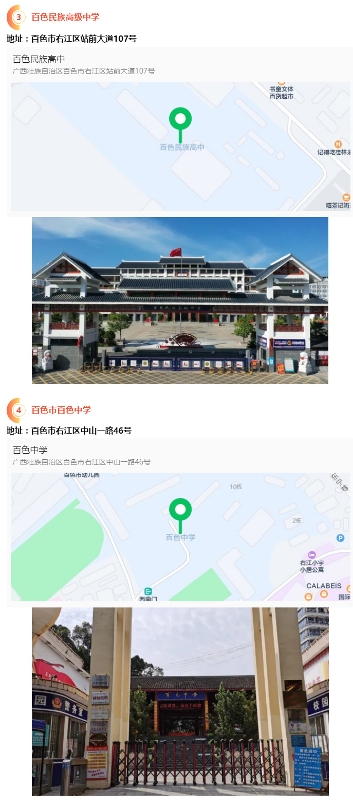 2.請(qǐng)?zhí)崆笆煜た键c(diǎn)地址,做好路線、住宿的安排。本次考試參考人數(shù)較多,考點(diǎn)分布分散,建議考生考前實(shí)地察看考點(diǎn),確認(rèn)考點(diǎn)入口位置,防止走錯(cuò)考點(diǎn)。請(qǐng)充分考慮考點(diǎn)周邊交通通行情況和停車場(chǎng)地容量,合理安排出行方式,預(yù)留充足時(shí)間,確保考試當(dāng)天按時(shí)到達(dá)。另外,考試期間百色市及各考點(diǎn)學(xué)校周邊的住宿比較緊張,請(qǐng)?zhí)崆邦A(yù)定。