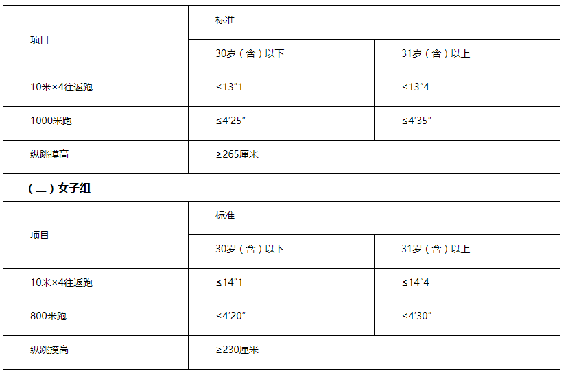 體能測評三項全部達標方為合格。體能測評項目中,縱跳摸高的測試次數(shù)不超過3次,10米×4往返跑的測試次數(shù)不超過2次,長跑項目(男子1000米、女子800米)的測試次數(shù)為1次。