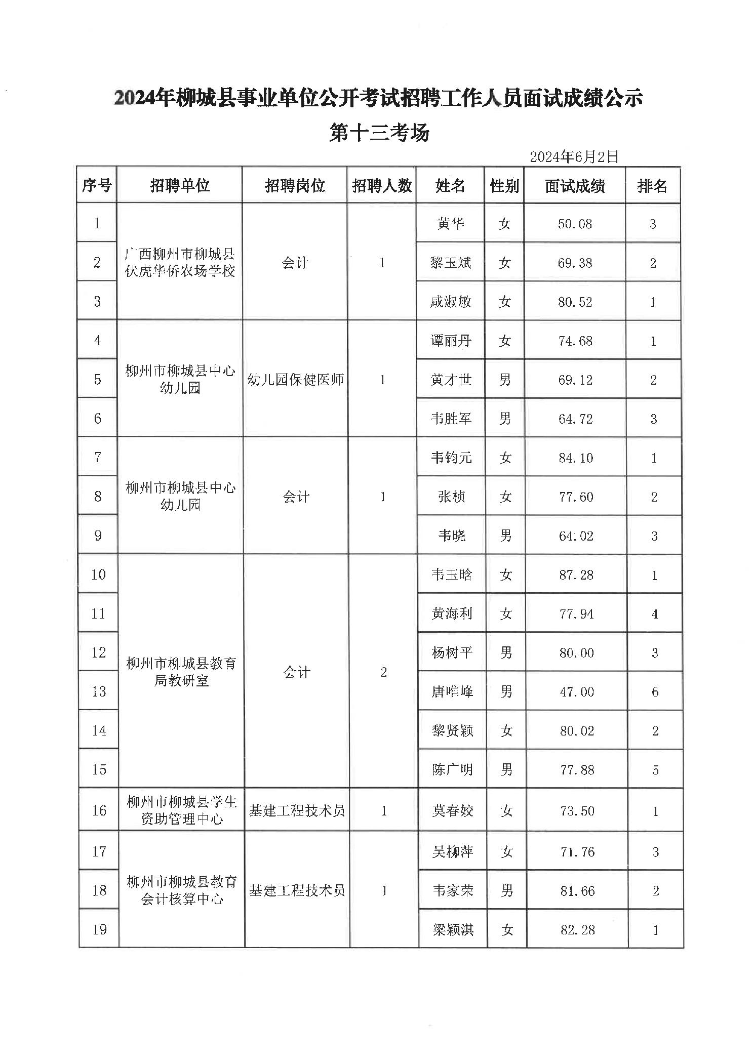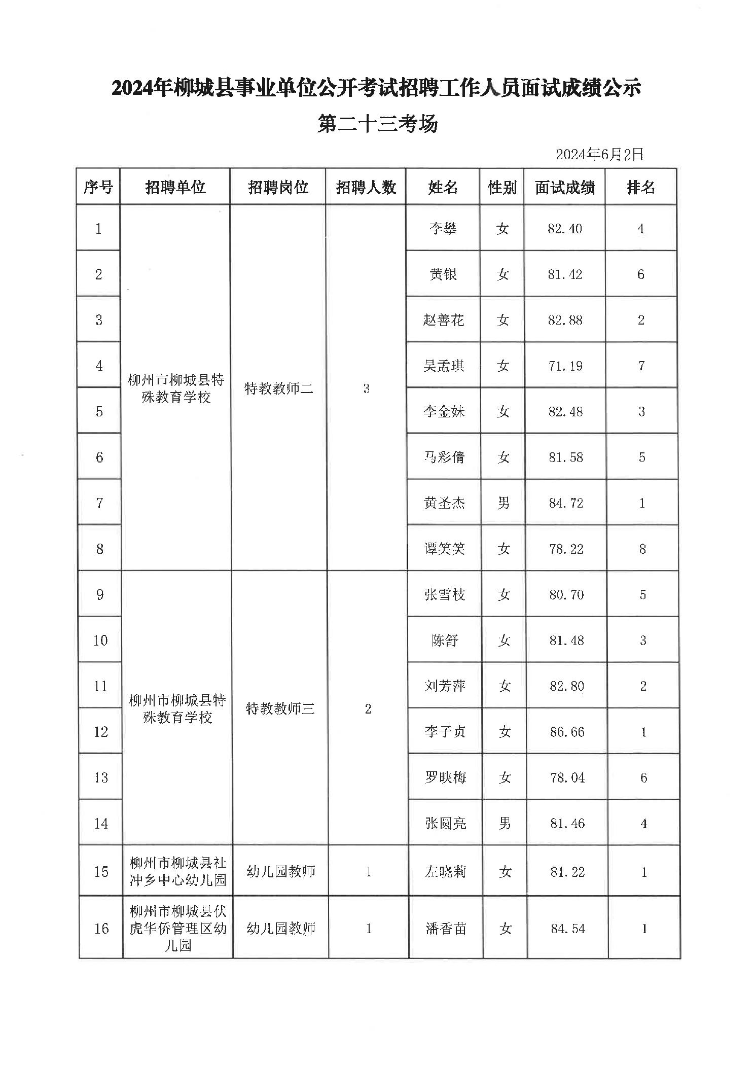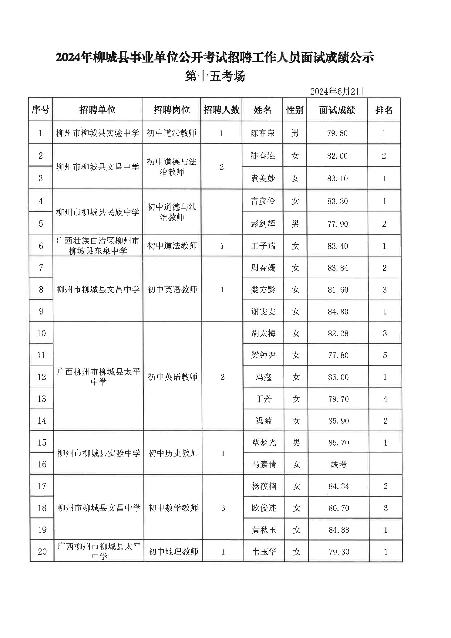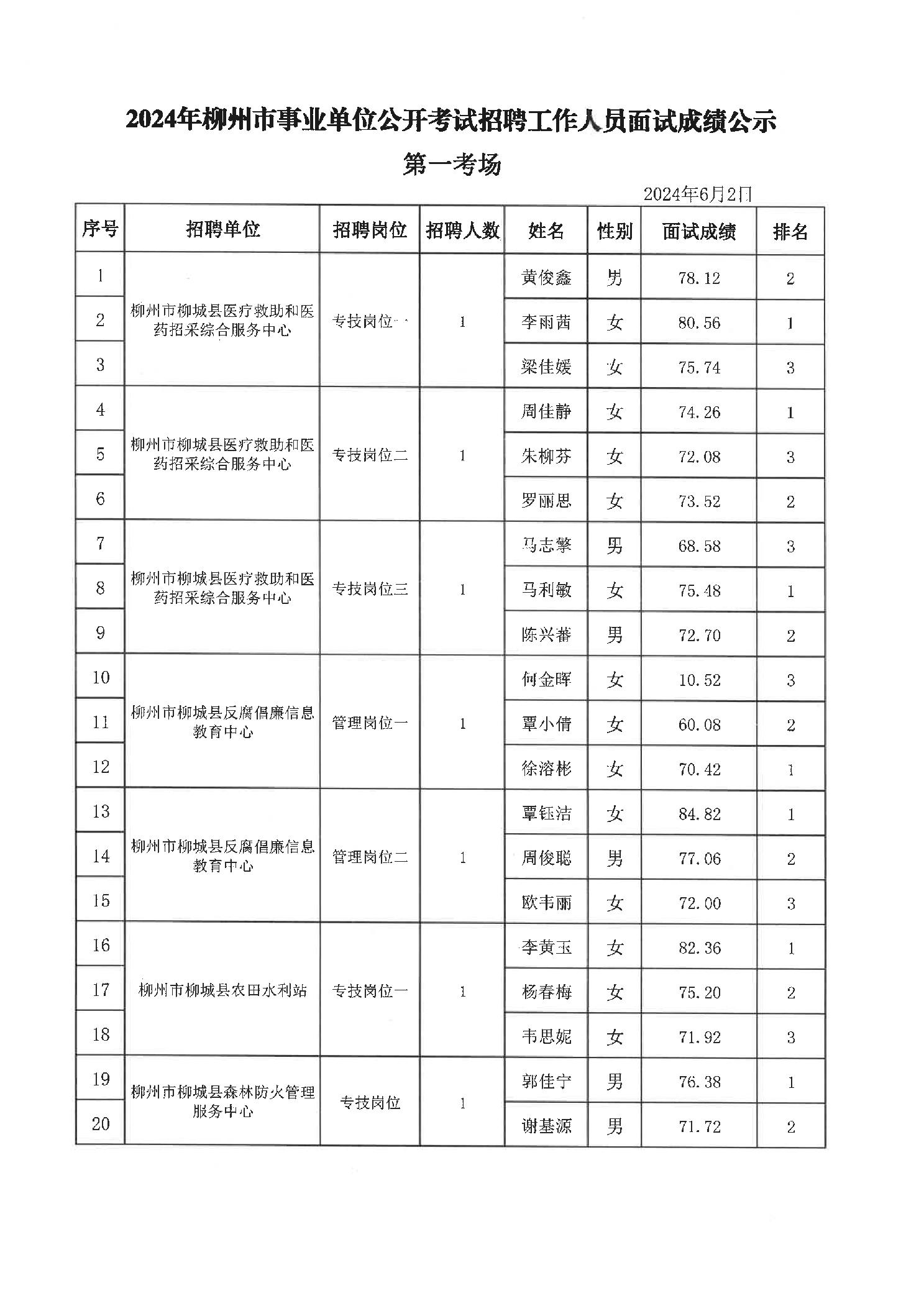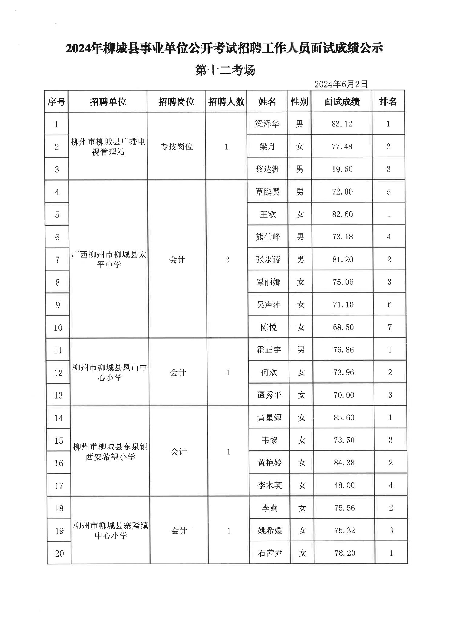 原文標題:2024年柳州市事業(yè)單位公開考試招聘工作人員面試成績公示(柳城縣崗位)