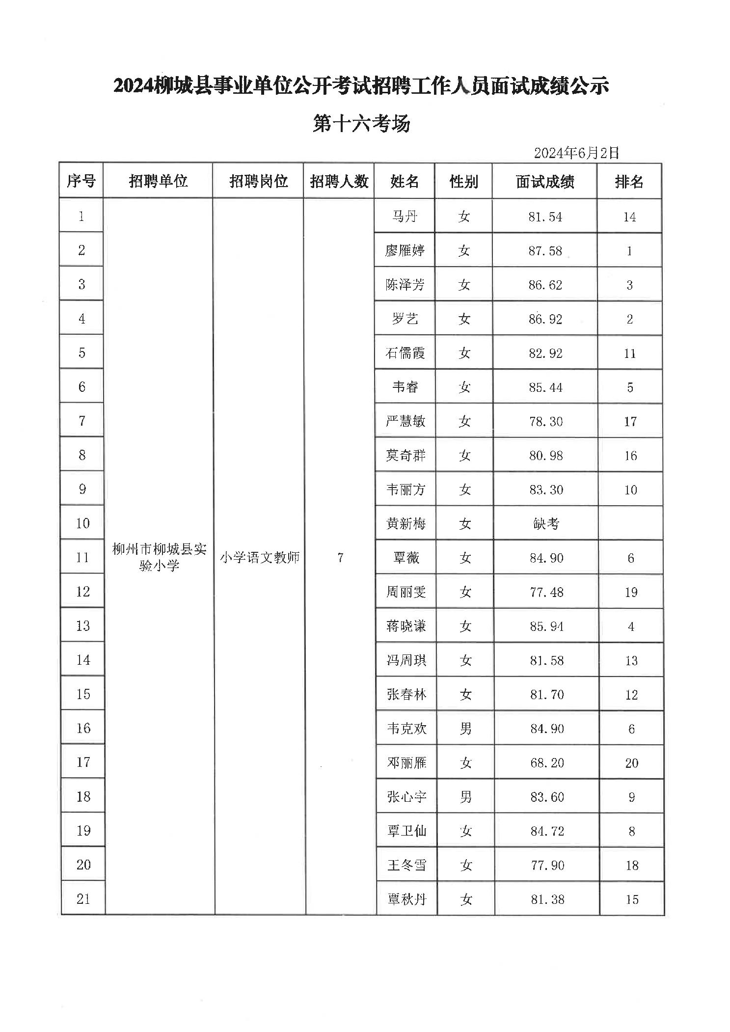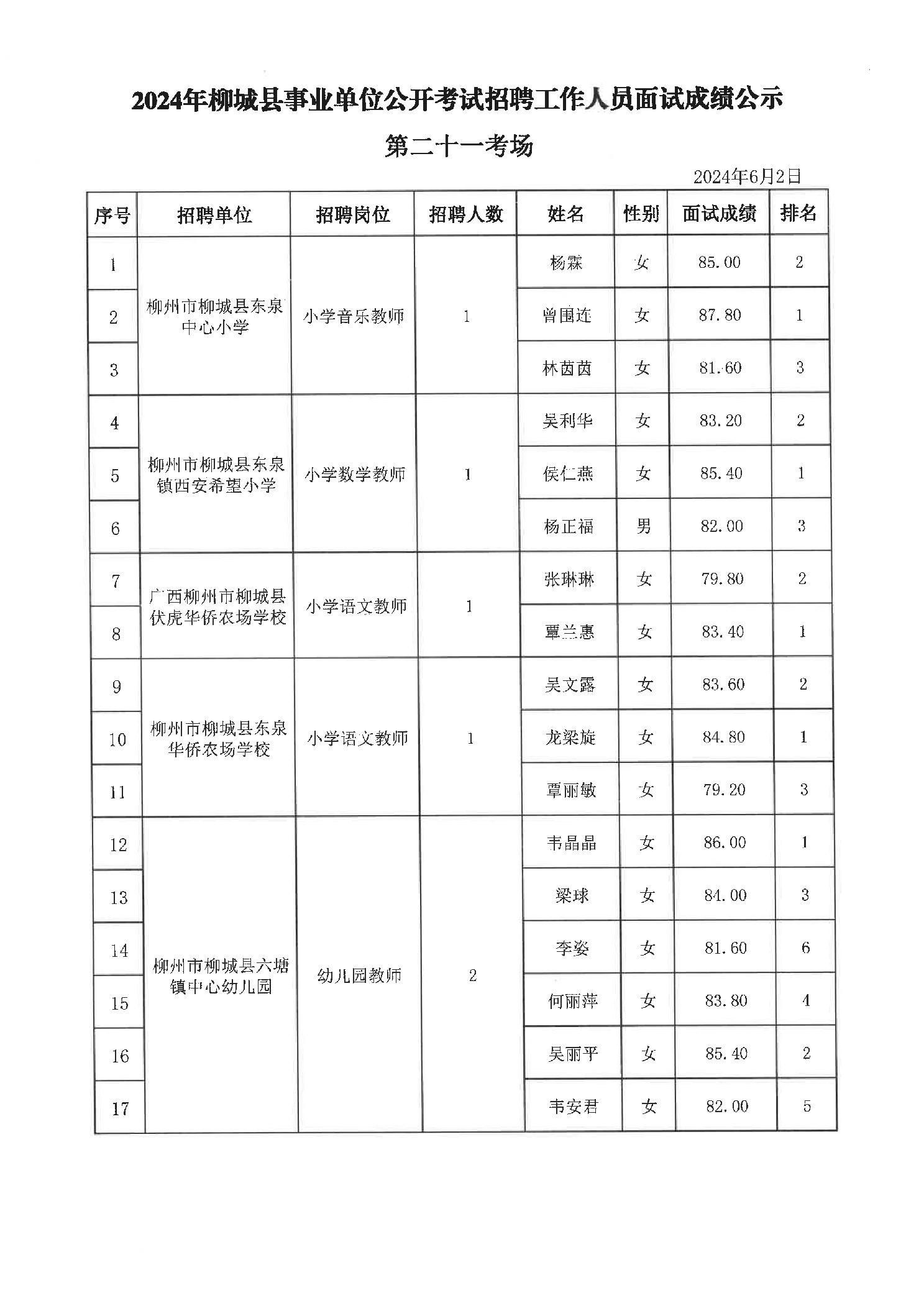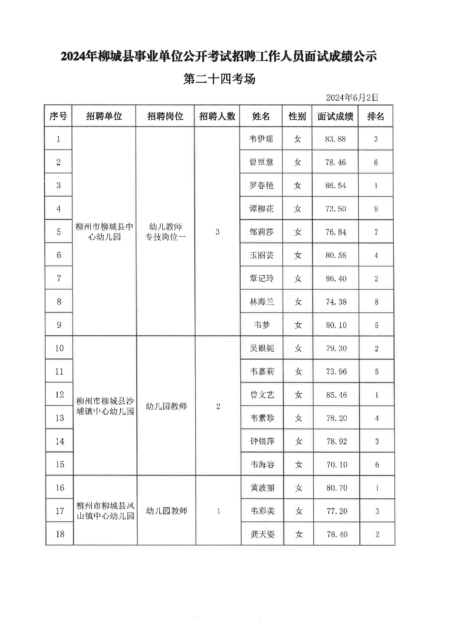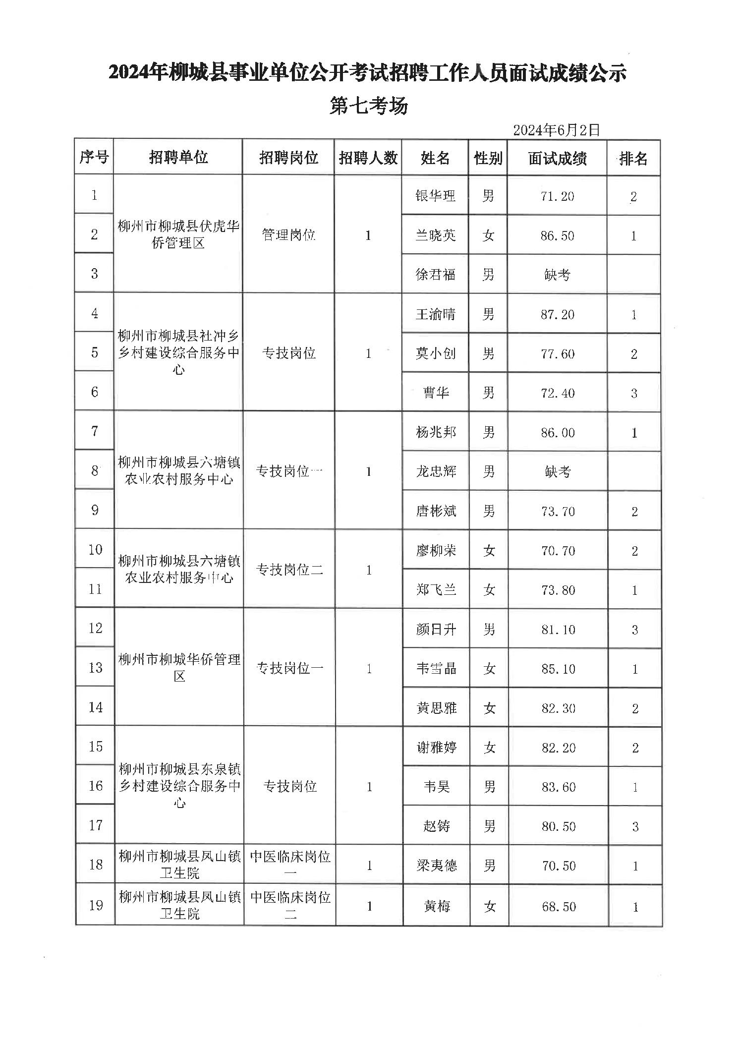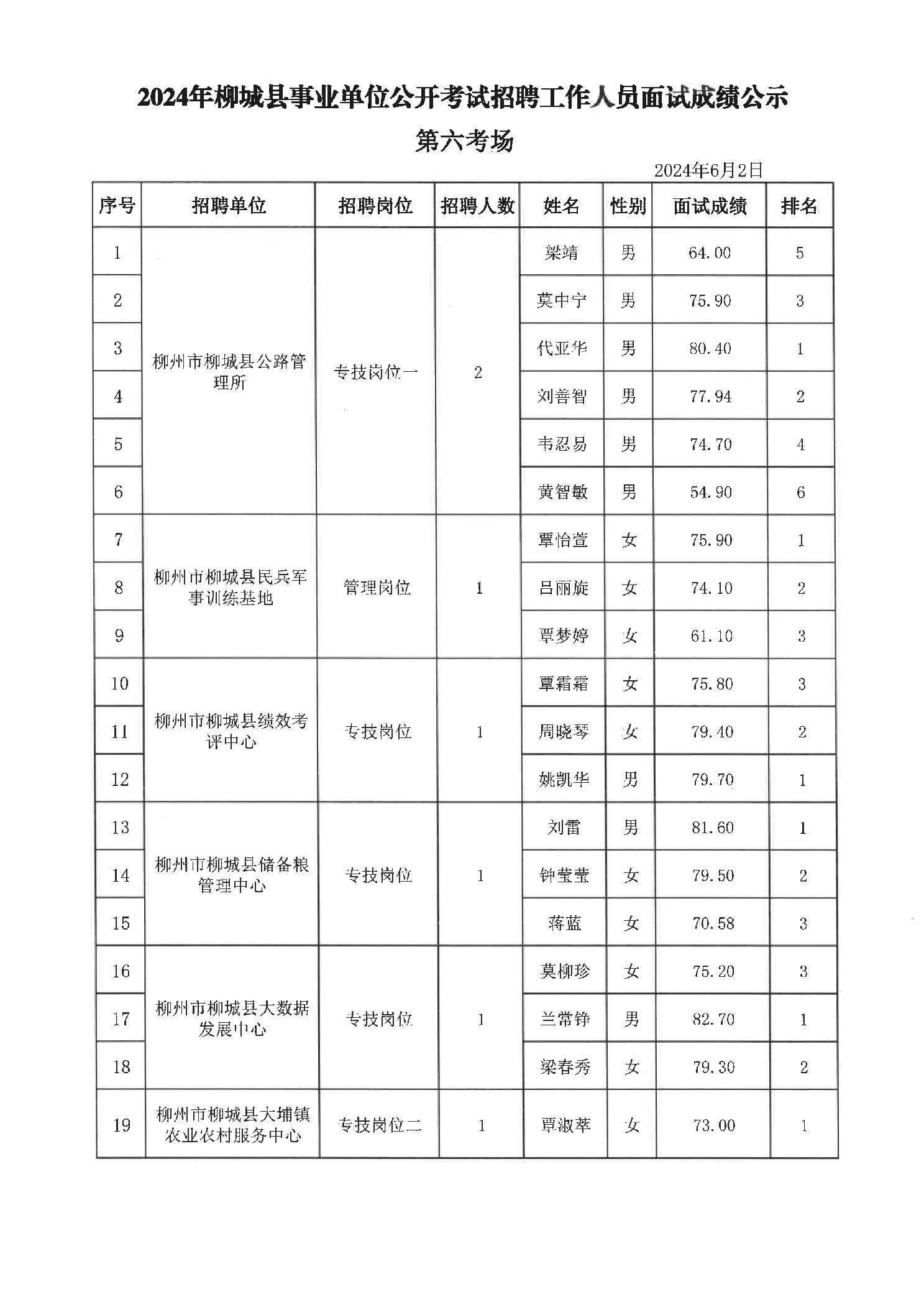 原文標題:2024年柳州市事業(yè)單位公開考試招聘工作人員面試成績公示(柳城縣崗位)