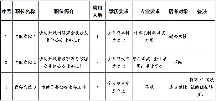 (六)同等條件下,優(yōu)先招聘公安烈士和因公犧牲公安民警、在職公安民警子女、退役士兵、見義勇為積極分子和先進(jìn)個人、警察類或政法類院校畢業(yè)生、有政法工作經(jīng)驗的人員;