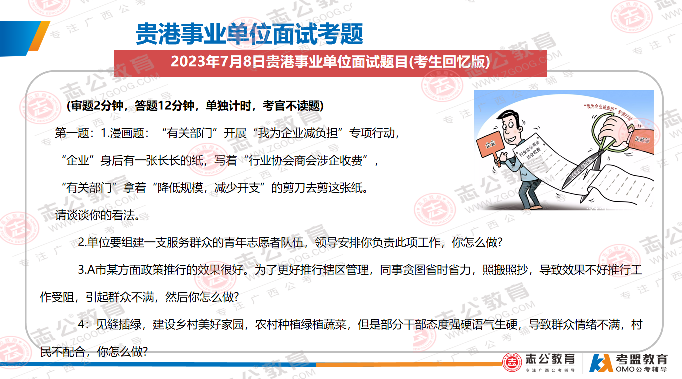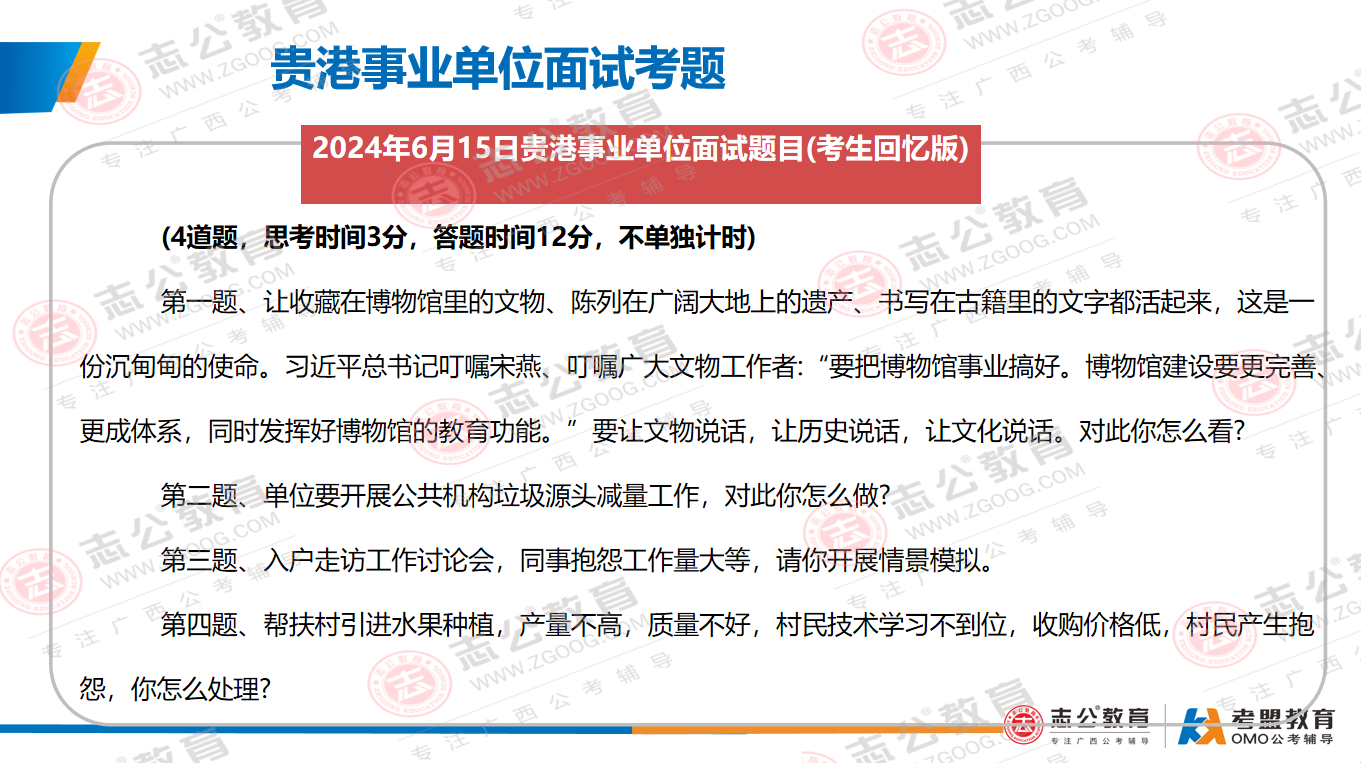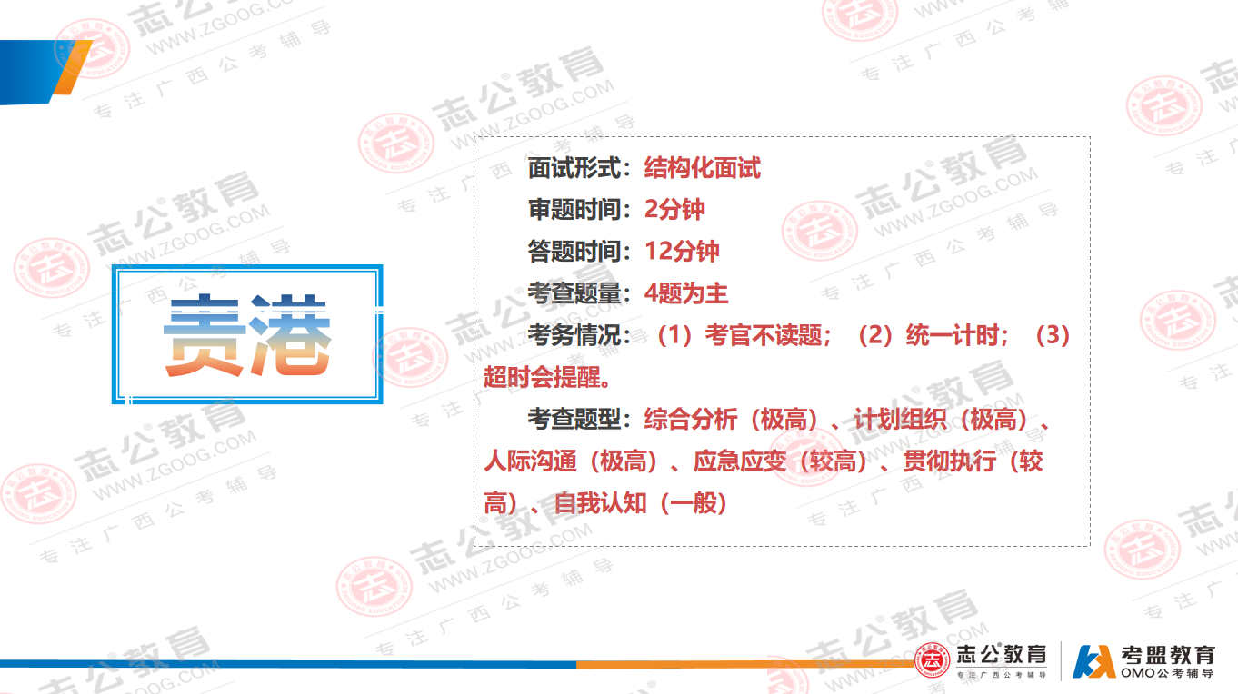貴港事業(yè)單位面試主要采用結(jié)構(gòu)化面試形式;審題時(shí)間:2分鐘;答題時(shí)間:12分鐘;考查題量:4題為主??紕?wù)情況:考官不讀題、統(tǒng)一計(jì)時(shí)、超時(shí)會(huì)提醒??疾轭}型:綜合分析(極高)、計(jì)劃組織(極高)、人際溝通(極高)、應(yīng)急應(yīng)變(較高)、貫徹執(zhí)行(較高)、自我認(rèn)知(一般)。