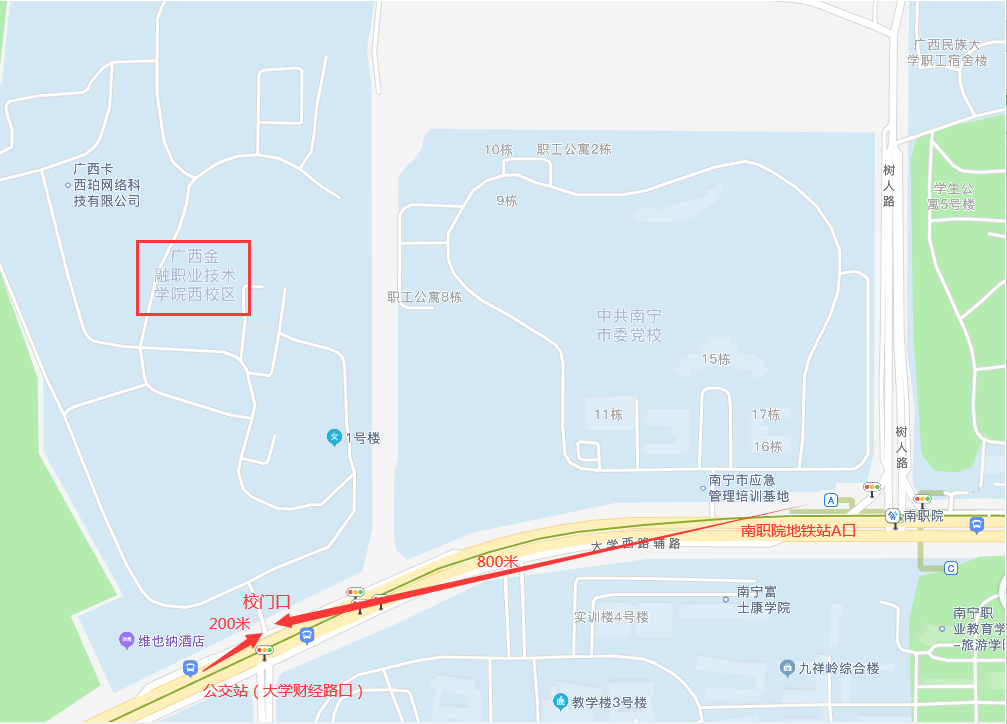 學(xué)校位于南寧市西鄉(xiāng)塘區(qū)大學(xué)西路168號,可乘坐公交車103路、807路大學(xué)財經(jīng)路口下,或乘坐地鐵1號線到“南職院”站A口出站(如圖所示)。