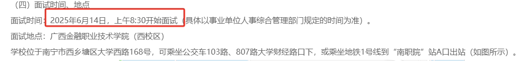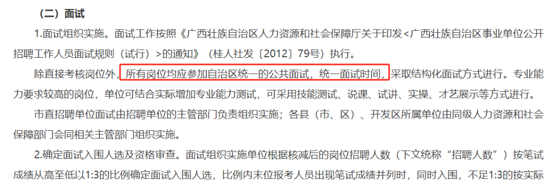 還剩下廣西區(qū)直單位(招錄1535人)的大部分面試資審名單尚未發(fā)布,不過這兩天各個區(qū)直單位應該也會發(fā)完了。廣西各地市是什么時候面試?大概、也許、廣西地市也是6月14、15日面試哦,由區(qū)直事業(yè)單位、南寧事業(yè)單位等招錄公告可知“面試采取公共結構化面試方式進行,自治區(qū)統(tǒng)一公共結構化面試時間”,事業(yè)單位大部分都是結構化面試,而根據下方網傳圖片(面試時間定于6月14、15日),今年各地市可能真的統(tǒng)一面試時間,我們拭目以待: