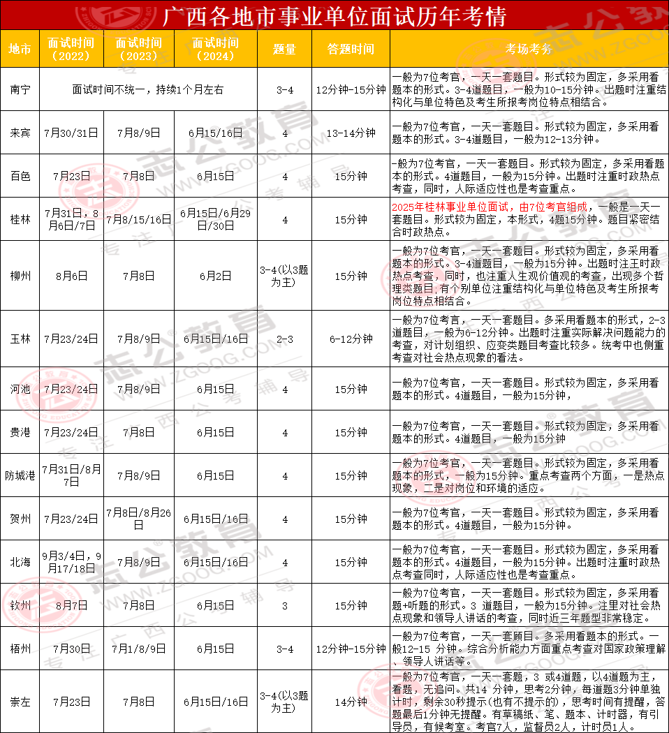 當然,我們還可以根據歷年廣西事業(yè)單位面試時間參考,推測全部地市是不是集中面試,小志給大家整理了歷年廣西各地事業(yè)單位面試時間、題量、答題時間、考場考務,大家可以從下圖看出。