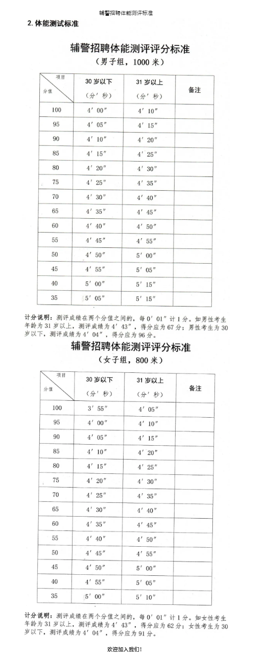 1.測試項目。長跑(男子1000米跑,女子800米),體能測試計分數(shù),滿分為100分,評分標準附后。