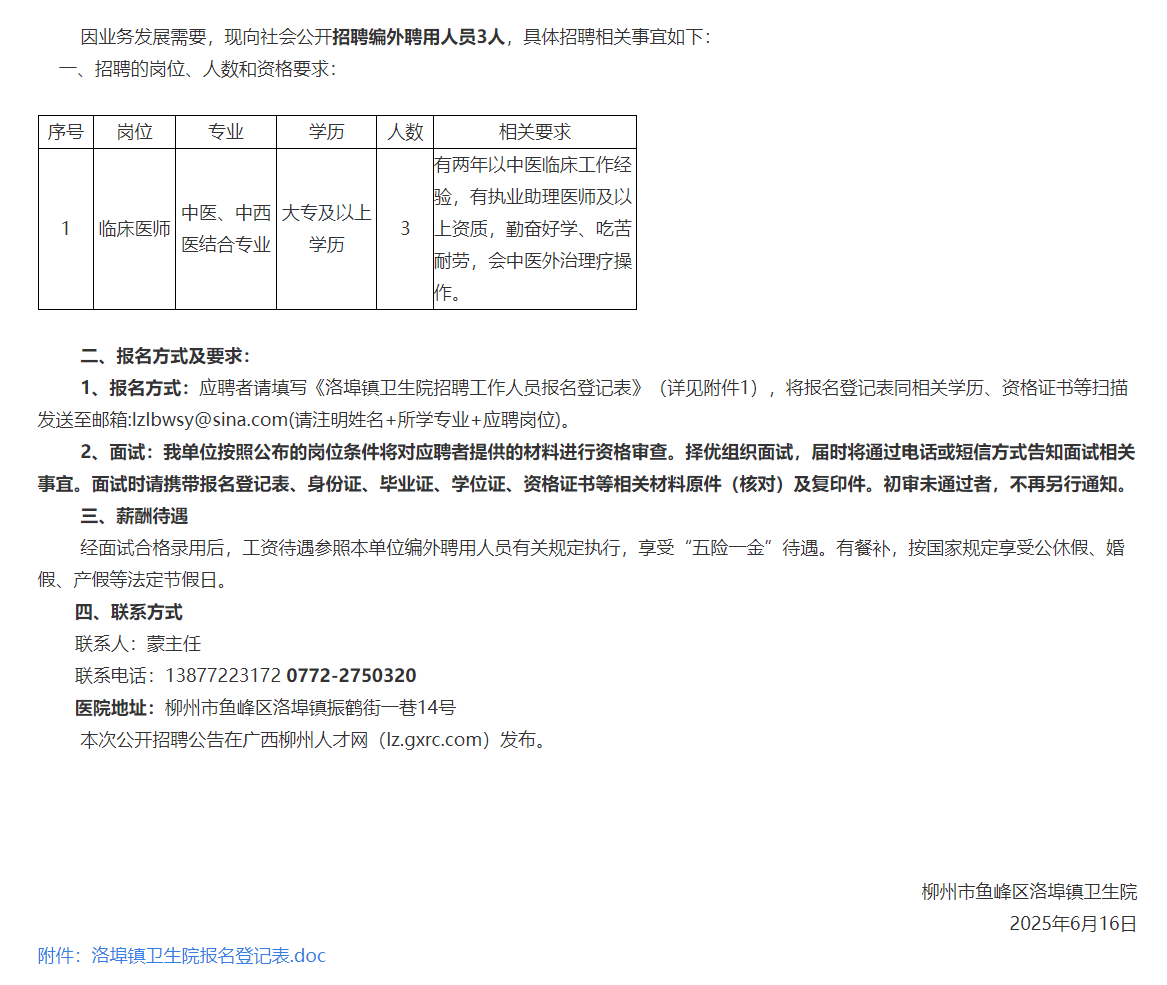 柳州市魚(yú)峰區(qū)洛埠鎮(zhèn)衛(wèi)生院招聘3人