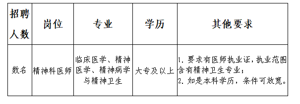 根據(jù)業(yè)務(wù)發(fā)展需要,持續(xù)加強(qiáng)我市心理健康和精神衛(wèi)生服務(wù)能力建設(shè),更好地滿足我市廣大人民群眾看病就醫(yī)需求,我院特面向社會(huì)公開(kāi)招聘數(shù)名編制外聘用工作人員,現(xiàn)將有關(guān)事項(xiàng)公告如下: