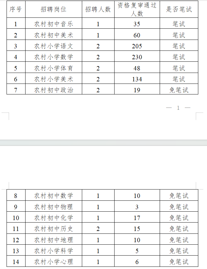 根據(jù)《桂林市雁山區(qū)2025年特崗教師招聘公告》要求“筆試按實(shí)際通過資格復(fù)審人數(shù)開考;招聘崗位資格復(fù)審?fù)ㄟ^人數(shù)不足20人免筆試,資格復(fù)審?fù)ㄟ^人數(shù)20人以上(含20人,研究生及以上學(xué)歷不包含在內(nèi),研究生及以上學(xué)歷免筆試),需進(jìn)行筆試。”經(jīng)現(xiàn)場資格復(fù)審,桂林市雁山區(qū)2025年特崗教師招聘筆試、免筆試學(xué)科崗位情況如下: