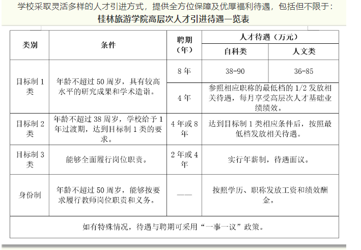 4.根據(jù)自治區(qū)政府文件要求,符合相應(yīng)條件者,學(xué)校積極配合申請廣西壯族自治區(qū)高層次人才認(rèn)定和各類人才項(xiàng)目,若入選可享受各類優(yōu)厚的人才待遇,詳情請登錄廣西高層次人才“一站式”服務(wù)平臺(http://www.gxrc.org/)查閱。首次來桂工作的35歲以下、具有博士學(xué)位的青年人才,可按照政策申領(lǐng)自治區(qū)青苗人才普惠性支持。如入選桂林市高層次人才,還可以享受桂林市高層次人才有關(guān)津貼、購房補(bǔ)貼和個稅獎勵等人才補(bǔ)助。詳見桂林市高層次人才一站式服務(wù)平臺(https://gcc.glrcw.com/)。