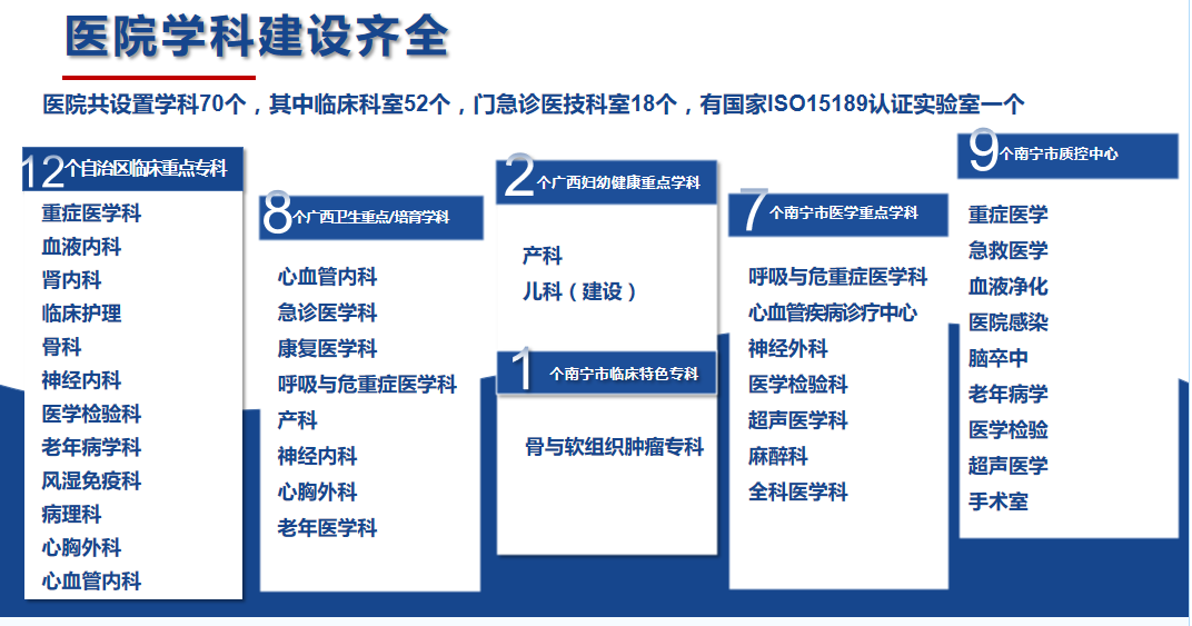 南寧市第一人民醫(yī)院(南寧市兒童先天性心血管疾病研究所、南寧市呼吸道疾病研究所、廣西醫(yī)科大學(xué)第五臨床醫(yī)學(xué)院、廣西醫(yī)科大學(xué)第五附屬醫(yī)院)始建于1914年,是一家擁有百年歷史的國(guó)家三級(jí)甲等綜合性醫(yī)院。醫(yī)院設(shè)有52個(gè)臨床病區(qū),18個(gè)門(mén)診醫(yī)技科室,總開(kāi)放床位1912張(含分院)。醫(yī)院是國(guó)家高級(jí)認(rèn)知中心建設(shè)單位及國(guó)家神經(jīng)介入建設(shè)中心、國(guó)家ISO15189醫(yī)學(xué)檢驗(yàn)認(rèn)證機(jī)構(gòu),國(guó)家聯(lián)盟中心認(rèn)證的胸痛中心、卒中中心;擁有廣西臨床重點(diǎn)專(zhuān)科(含培育)12個(gè)、自治區(qū)醫(yī)療衛(wèi)生重點(diǎn)學(xué)科(含培育)8個(gè)、自治區(qū)婦幼健康服務(wù)重點(diǎn)學(xué)科(含建設(shè))2個(gè)、南寧市醫(yī)學(xué)重點(diǎn)學(xué)科7個(gè)、南寧市臨床特色優(yōu)勢(shì)專(zhuān)科1個(gè),南寧市質(zhì)控中心9個(gè)。醫(yī)院是國(guó)家衛(wèi)健委創(chuàng)面修復(fù)能力建設(shè)和繼續(xù)教育中心教學(xué)基地、國(guó)家級(jí)住院醫(yī)師規(guī)范化培訓(xùn)培訓(xùn)基地,廣西醫(yī)科大學(xué)碩士研究生培養(yǎng)基地,同時(shí)是暨南大學(xué)共建醫(yī)學(xué)教育基地、第十批廣西博士后創(chuàng)新實(shí)踐基地;醫(yī)院還具備國(guó)家藥物臨床試驗(yàn)機(jī)構(gòu)資質(zhì)(含I期研究室);醫(yī)院醫(yī)學(xué)實(shí)驗(yàn)中心獲批廣西科技廳重點(diǎn)實(shí)驗(yàn)室“廣西智慧精準(zhǔn)醫(yī)學(xué)實(shí)驗(yàn)室”,是南寧市衛(wèi)健系統(tǒng)唯一的省級(jí)重點(diǎn)建設(shè)實(shí)驗(yàn)室。2019年在市委市政府支持下,成立南寧市第一人民醫(yī)院醫(yī)療集團(tuán)?,F(xiàn)有27家成員單位,形成“1+4+22”(中心醫(yī)院+4家二級(jí)醫(yī)院+22家基層衛(wèi)生及養(yǎng)老機(jī)構(gòu))一體化格局,推行“三二一”運(yùn)營(yíng)管理模式,逐步構(gòu)建全生命周期健康管理鏈。