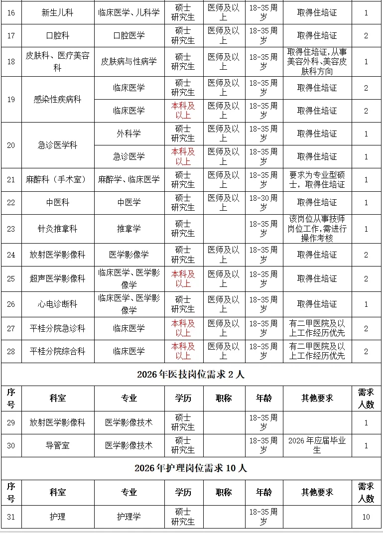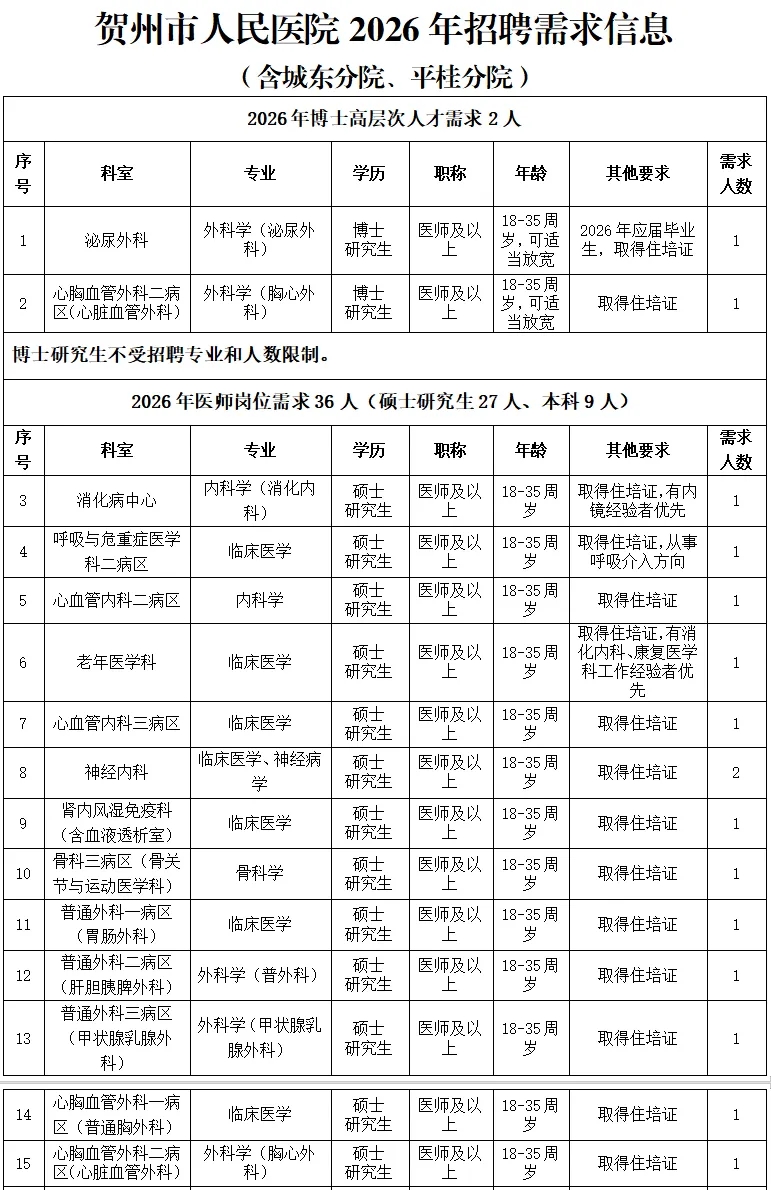 根據(jù)醫(yī)院發(fā)展規(guī)劃,招聘工作堅持公平公正公開,堅持德才兼?zhèn)洹⑷藣徬噙m、擇優(yōu)錄取、雙向選擇的原則,2026年計劃引進(jìn)博士、碩士高層次人才及招聘工作人員共計50名(詳見附件:賀州市人民醫(yī)院2026年招聘需求信息)。