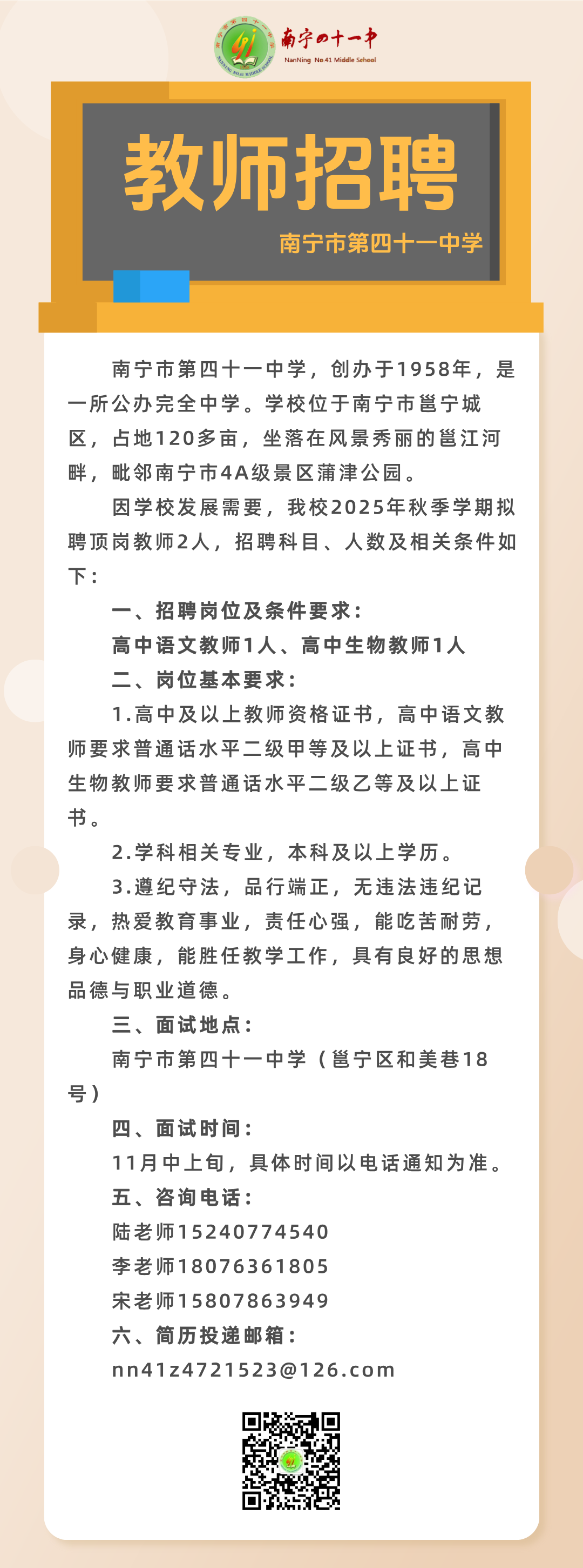 2025年秋季學(xué)期南寧市第四十一中學(xué)關(guān)于公開招聘頂崗教師的啟事
