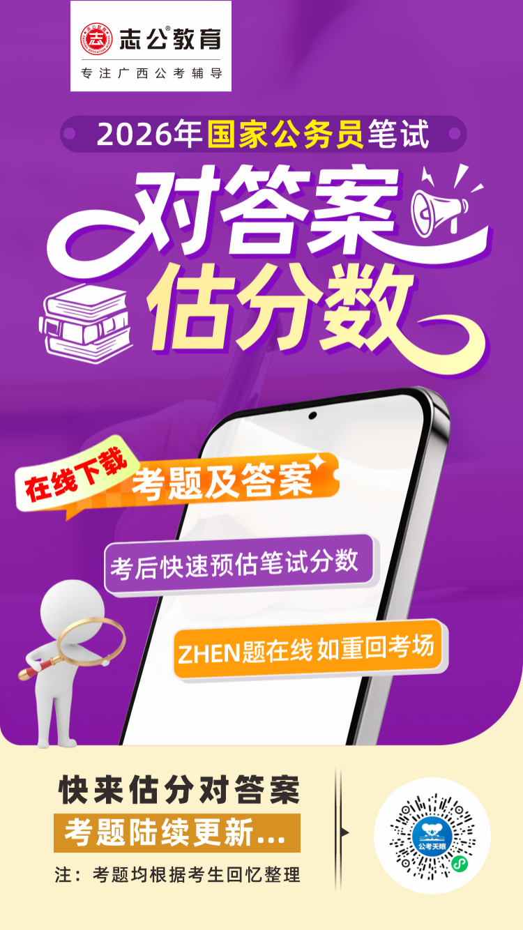 剛走下考場?志公教育為廣西考生整理了2026國考筆試考及答案在線下載服務,推出在線估分平臺,助你快速預估分數(shù)。