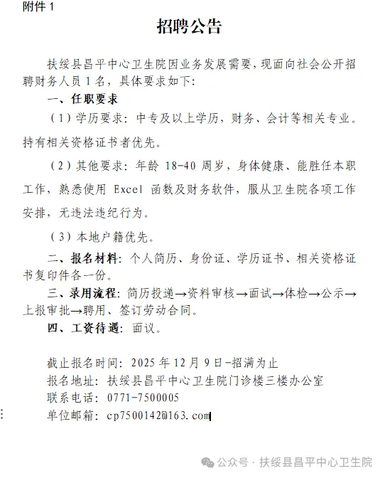 原文標(biāo)題:2025年崇左扶綏縣昌平中心衛(wèi)生院公開(kāi)招聘財(cái)務(wù)工作人員1人