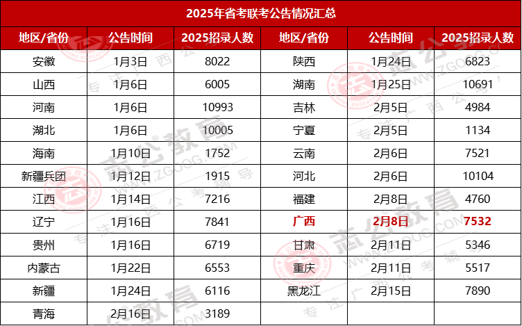 由廣西壯族自治區(qū)公務(wù)員局發(fā)布,核心查詢平臺為八桂先鋒網(wǎng)、廣西人事考試網(wǎng),也可在各市黨建網(wǎng)、人事考試相關(guān)平臺查看。2025年公告發(fā)布時(shí)間為2月8日。