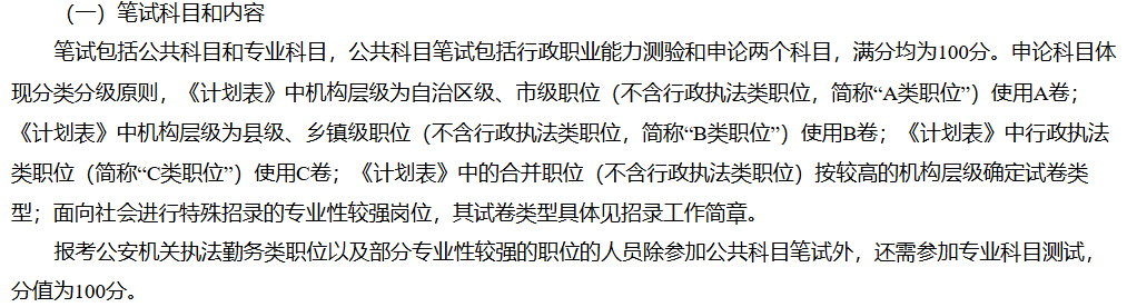 公共科目為行政職業(yè)能力測驗(yàn)(100 分)、申論(100 分)。申論分 A/B/C 卷:自治區(qū) / 市級職位(非行政執(zhí)法類)用 A 卷;縣 / 鄉(xiāng)鎮(zhèn)級職位(非行政執(zhí)法類)用 B 卷;行政執(zhí)法類職位用C卷。