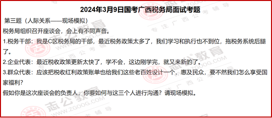 3??人際關(guān)系題:以 “座談會現(xiàn)場模擬” 的形式,直接還原稅務(wù)工作中的溝通場景 —— 既要回應(yīng)干部的 “政策學習壓力”,也要解決企業(yè)的 “政策更新焦慮”,還要滿足群眾的 “紅利獲得感訴求”,考察的是 “換位思考 + 實務(wù)解決能力”。