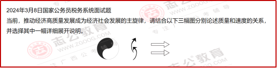 再來看2024年3月8日的 “質(zhì)量與速度” 題,更是結(jié)合經(jīng)濟政策 + 稅務(wù)職能,要求用 “太極圖” 等符號具象化論述,體現(xiàn)了 “稅務(wù) + 宏觀政策” 的復(fù)合考察。