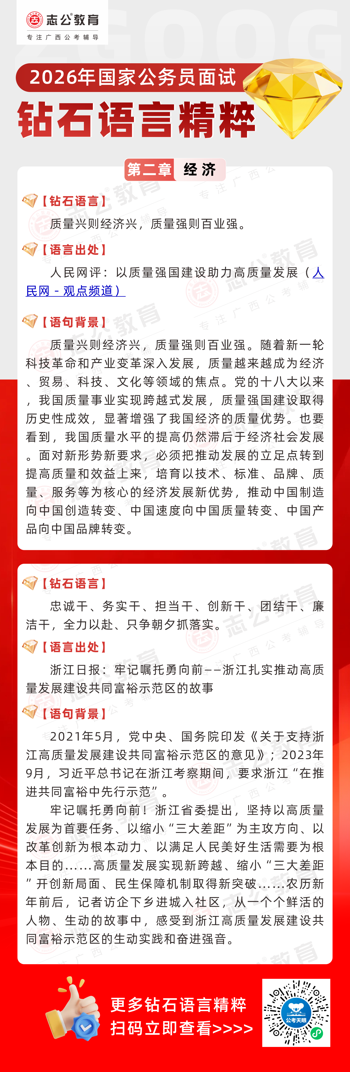 志公教育推出《2026國家公務(wù)員面試·鉆石語言精粹》!幫助考生把握經(jīng)濟類題目應(yīng)答邏輯,提升語言表達層次,助你在面試中脫穎而出。備考2026國考面試,從掌握“鉆石語言”開始!